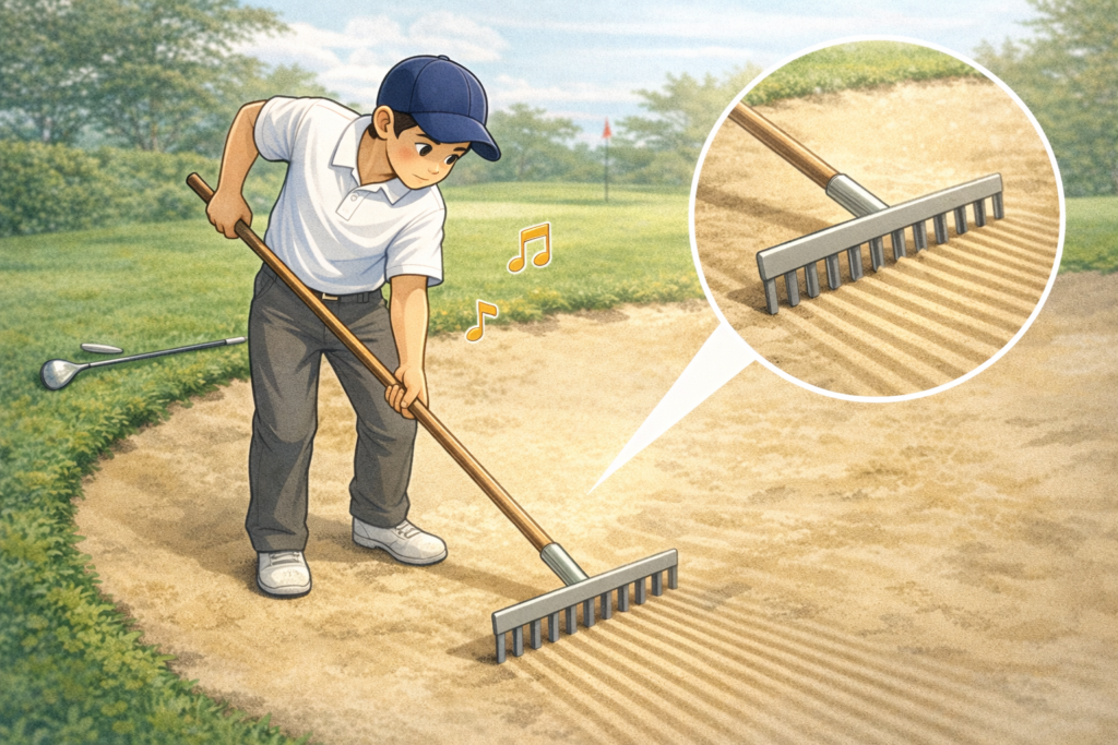 プレーをした後のバンカーは、足跡や打った跡などデコボコしてしまいます
